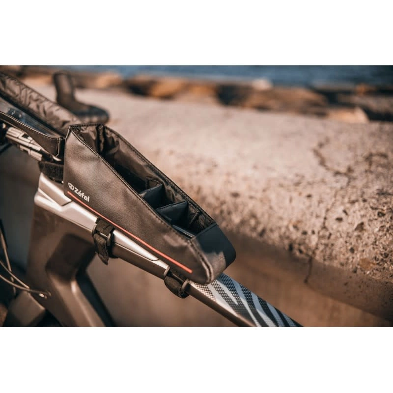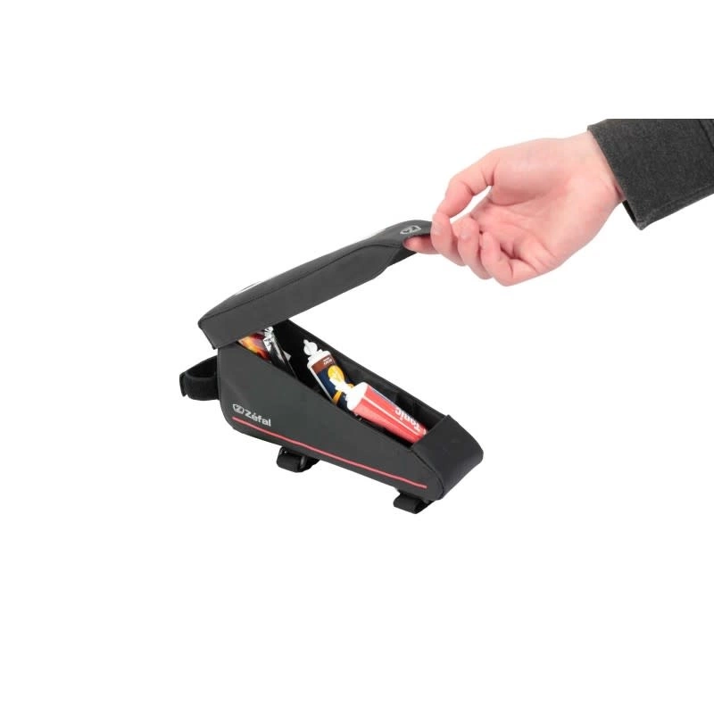 La Z Race S es una bolsa de cuadro concebida para triatletas y corredores de gran fondo que quieren mantener sus barras y geles al alcance. La Z Race S es una bolsa de cuadro que se fija en la parte delantera del tubo superior, ya sea con correa auto agarre o con tornillos. La ventana transparente y la apertura del imán garantizan a los ciclistas un acceso rápido y fácil al contenido de la bolsa (barras, geles,…). La presencia de una compartimento extraíble dentro del Z Race S permite optimizar el almacenamiento de los barras en función las necesidades del ciclista.